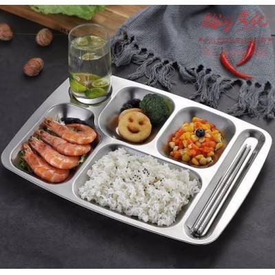 屋田304不锈钢餐盘六格加厚加深订制刻字食堂分格餐盘碗勺筷套装成人SKU:yzwhyp864943