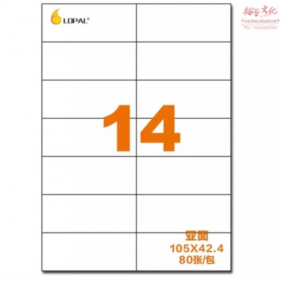 首页 > 办公用品 > 文具 > 乐标 (lopal) A4不干胶标签纸打印纸贴纸空白书写纸激光喷墨打印纸多格切割-亚面直角 亚面14格105*42.4mm 80张/包SKU:yzwhyp877542