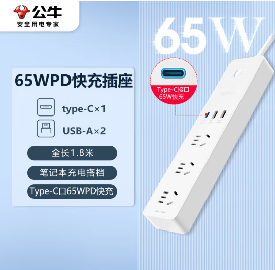 首页 > 建筑建材 > 开关插座 > 公牛(BULL)65W PD快充C口USB插座/插线板/插排/排插/拖线板 3USB 3孔全长1.8米 GNV-UU2653 (zhyghf_221711927)SKU:yzwhyp884939