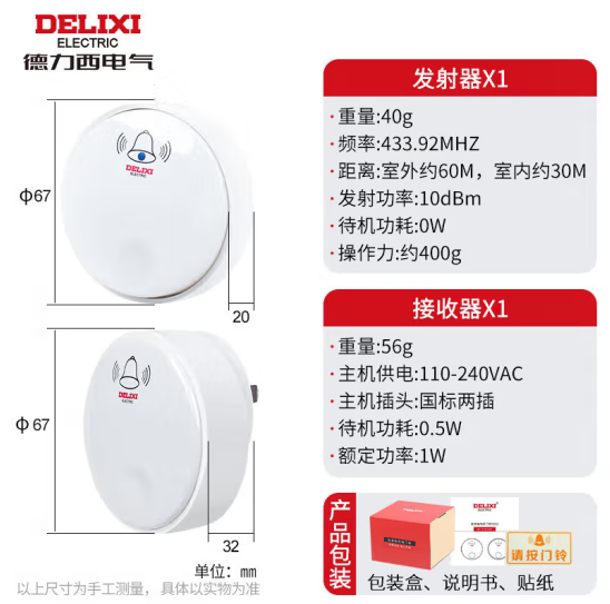 德力西电气 无线门铃自发电老人呼叫器家用DED21 1个按键1个响铃 (zhyghf_221717602)SKU:yzwhyp885357