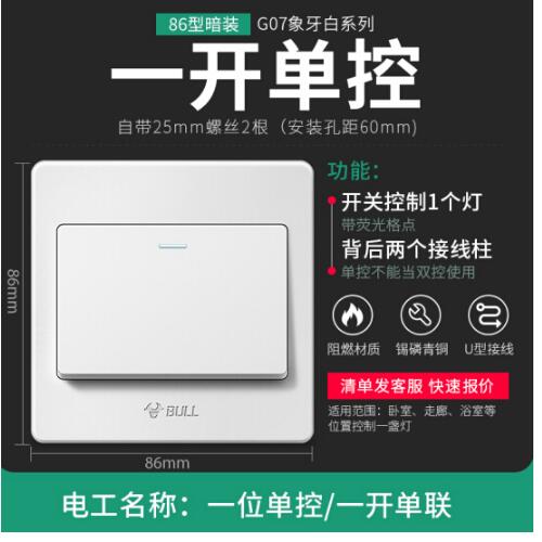 公牛(BULL) 开关插座 G07系列 一开单控开关 86型面板G07K111Y 白色 暗装(zhyghf_330202373)SKU:yzwhyp885817