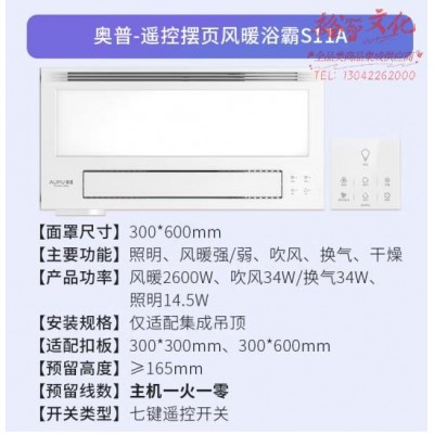 奥普(AUPU)浴霸S11A风暖浴霸 宽摆页出风 强弱风暖 无线遥控 适配集成吊顶(zhyghf_23094305)SKU:yzwhyp894065