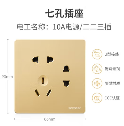 视贝(SEEBEST)七孔插座 开关插座墙壁开关金色系列 (zhyghf_221723940)SKU:yzwhyp908602