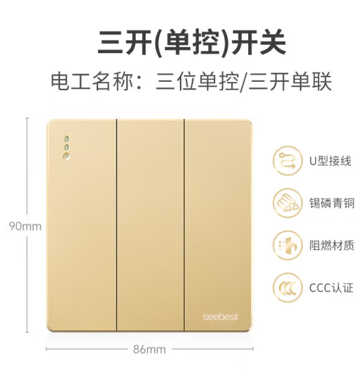 视贝(SEEBEST)三开单控 开关插座墙壁开关金色系列 (zhyghf_221723948)SKU:yzwhyp908625