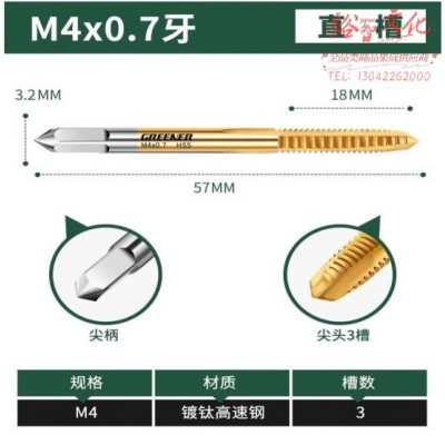 首页 > 建筑建材 > 五金附件 > 绿林(GREENER)机用丝锥丝攻不锈钢专用攻牙钻头螺旋 M4×0.7直槽 (zhyghf_93500762)SKU:yzwhyp910410
