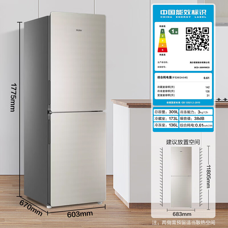海尔 双开门309升变频静音节能风冷无霜大冷冻室 BCD-309WMCO(SKU:yzwhyp917560