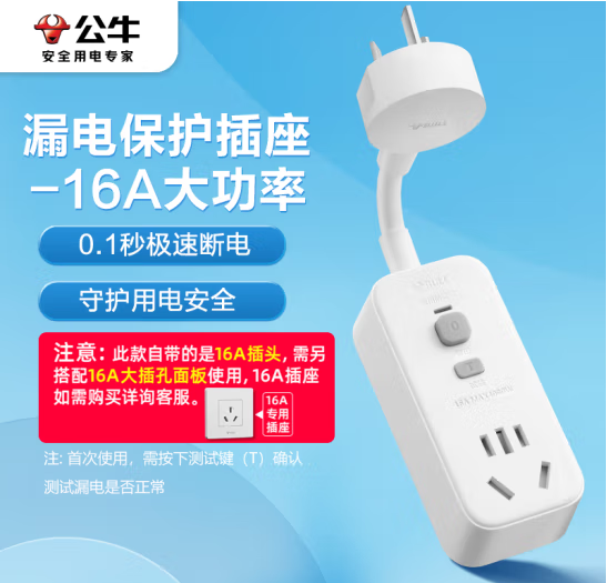 公牛GN-711D 漏电保护器插头16A 热水器空调大功率防漏电插头转换器 (SKU:yzwhyp918747