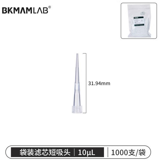 比克曼生物(BKMAM)移液器袋装吸头一次性无菌吸嘴加样枪枪头通用高适配 10μL短吸头1000支/袋 无滤芯 (SKU:yzwhyp920794