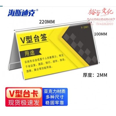 首页 > 建筑建材 > 其他防护用品 > 海斯迪克 HKW-335 亚克力V型台卡桌牌 展示牌透明台牌 会议牌席卡桌签牌台号牌席位牌三角卡台座 220×100×2mm (SKU:yzwhyp924628