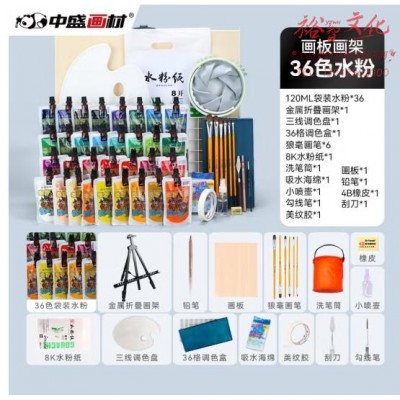 中盛画材 【含画架画板】36色水粉颜料套装初学者工具箱儿童水粉画笔洗笔桶美术生专业艺考画材集训画画纸 (SKU:yzwhyp928812