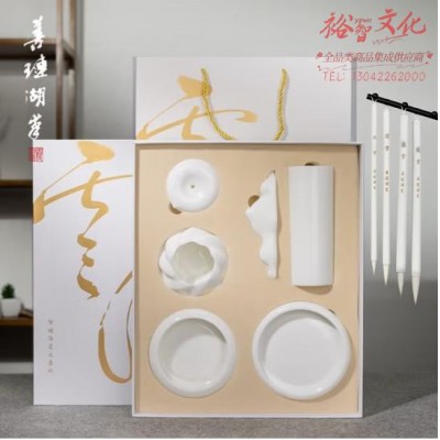 善琏湖笔 文房四宝毛笔套装笔筒笔搁水盂笔洗墨碟礼品礼盒练字瓷器初学者入门书法国画用品 【似雪如玉】文房礼盒 (SKU:yzwhyp929971