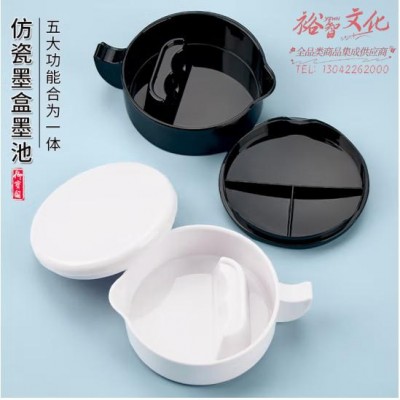 御宝阁 多功能仿瓷墨池防摔塑料书法绘画调色盘笔架笔山墨碟墨盘文房四宝初学者学生带盖小砚台盛墨专用 仿瓷-白色墨池(黑色联系客服) (SKU:yzwhyp943489