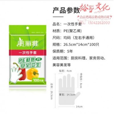 首页 > 建筑建材 > 手部防护 > 美丽雅 一次性手套100只入 PE材质加厚防漏卫生手套食品用 塑料手套厨房餐桌餐厅野餐适用 SKU:yzwhyp976336