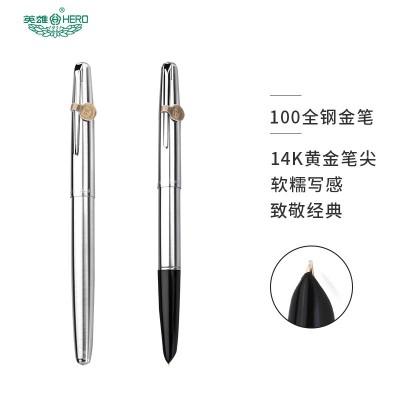 英雄(HERO)钢笔100全钢(14K)金尖钢笔金笔签字笔 墨水笔 银色银夹