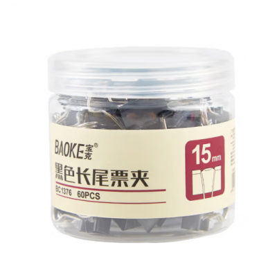 宝克(BAOKE) 长尾夹 彩色夹子票夹 大号金属燕尾夹票据夹子 桌面办公文具用品 黑色 15mm 筒/60pcs BC1376