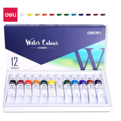 得力(deli)水彩颜料 12色12ml 大容量画画美术专用 便携专业级学生儿童绘画套装便携工具写生 画具画材73850
