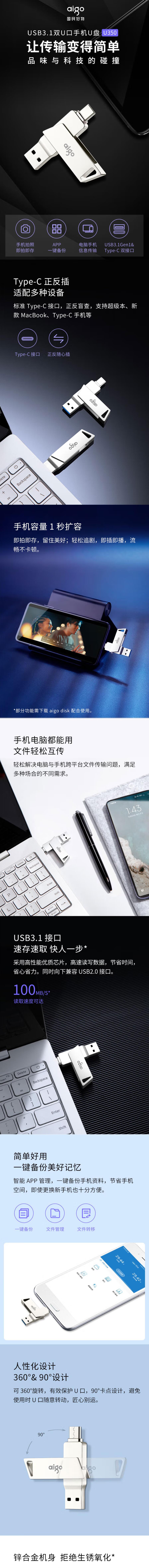 爱国者 64GB Type-C USB3.1 手机U盘 U350 银色 双接口手机电脑两用