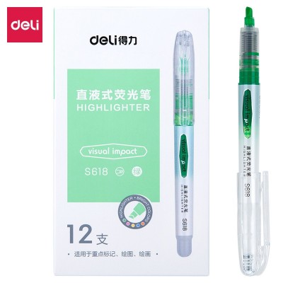 得力荧光笔S618直液式荧光笔考试复习重点标记笔彩色记号笔 软头荧光笔(绿)12支