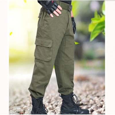 春秋加厚工装裤男休闲裤宽松焊工工作裤多口袋棉布长裤直筒工装裤军绿色【580纯棉斜纹单裤】尺码(185-190)
