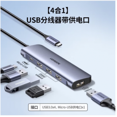 首页 > 信息化设备 > 数据线 > 绿联/UGREEN拓展坞typec分线器电脑转接头usb扩展器 pro转换器air雷电4hdmi投影 (4合1)USB3.0x4+Micro-USB供电 0.12m