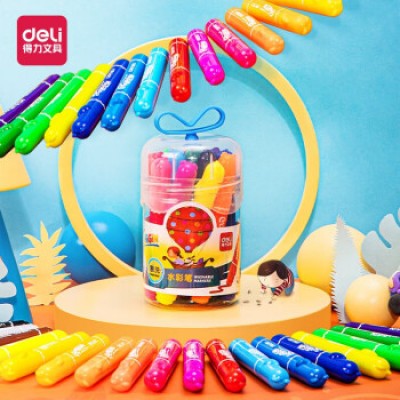 得力(deli)12色易水洗宝宝专用防刺圆头画画笔 儿童软胶提手桶装绘画彩笔 涂鸦笔 幼儿园水彩笔 70727