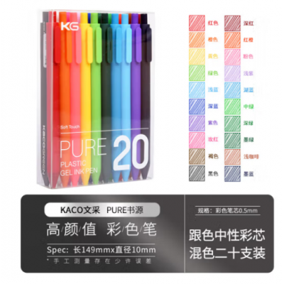 首页 > 办公用品 > 文具 > KACO彩色中性笔按动多色签字笔手账笔水笔0.5mm彩芯子弹头书源20支/盒K1015
