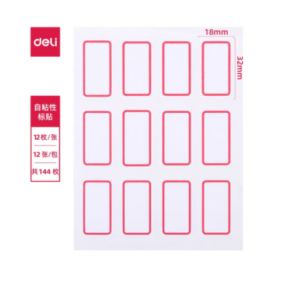 首页 > 办公用品 > 文具 > 得力(deli) 144枚18*32mm红框不干胶标签贴纸自粘性标贴姓名贴 7184