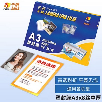 千帆(YIDU SAILS)塑封膜A3 8C照片过塑膜相片过胶膜透明护卡膜塑封纸过塑纸 303x426MMx8丝 100张