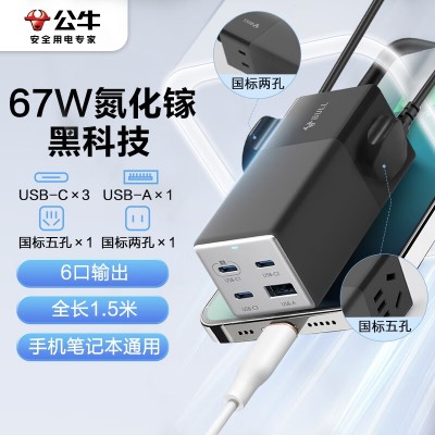公牛(BULL)氮化镓67W充电器快充笔记本插座/插线板/插排/接线板 USB(3C1A)+2插孔 GNV-MC1672灰色