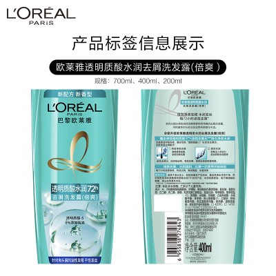 欧莱雅(LOREAL)透明质酸水润去屑洗发露(倍爽)400ml(无硅油)(新老包装随机发货) SKU:yzwhyp200931