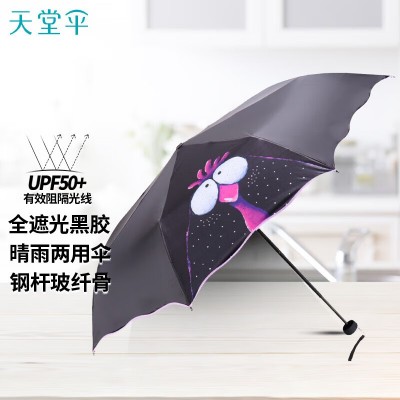 首页 > 建筑建材 > 其他防护用品 > 天堂伞 三折叠晴雨伞55cm*8骨全遮光黑胶卡通太阳伞遮阳伞 萌萌鸟玫红 SKU:yzwhyp304523
