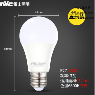 雷士(NVC)LED灯泡球泡 3瓦E27大螺口 光源节能灯 白光6500K 5只装 SKU:yzwhyp305306