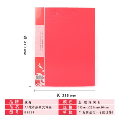 康百 康百A4彩色文件夹 写字垫板票据夹插页资料夹档案夹多功能文具夹 A4红色+单弹簧夹-B2603 SKU:yzwhyp202144